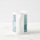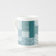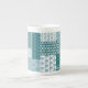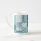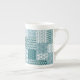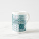 Eine schicke China Kaffee-Tasse, mit einem ethnischen Imitat Patchwork-Muster in Aquamarin und Weiß. Als Teil der Posh & Painterly 'Boho Bazaar' Kollektion kann dieses Muster leicht angepasst werden, indem die Richtung oder der Maßstab der Musterfliese für ein völlig anderes Aussehen geändert werden.