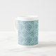Eine schicke China-Kaffee-Tasse mit einem ethnischen, traditionellen Ogee-Muster Aquamarin auf einem weißen Hintergrund, den Sie ändern können, wenn Sie möchten. Als Teil der Posh & Painterly 'Boho Bazaar' Kollektion kann dieses Muster leicht angepasst werden, indem die Richtung oder der Maßstab der Musterfliese für ein völlig anderes Aussehen geändert werden.