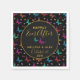 Hochzeitsnapkins mit einem schwarzen und goldenen Thema. Personalisieren Sie Ihre Hochzeitsinformationen in einem schwarzen Kreis mit goldfarbenem Rahmen. Text ist in der Farbe Gold geschrieben. Typografie sagt: Glücklich immer danach. Der Hintergrund besteht aus einem eleganten Muster mit einer grafischen Abbildung von flatternden Schmetterlingen in vielen hellen Farben, die sehr schön auf dem schwarzen Hintergrund kontrastieren. Whimsikale Blumen, Zierspieße und Blätter verleihen dem Raum einen gewissen Charme.
