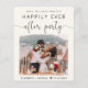 Ein Ankündigung Datum freihalten für Hochzeitsfeiern oder Feiern nach Ihrer Hochzeit oder privaten Hochzeiten. An der Vorderseite steht Ihr Foto "Save the Date für unser glückliches aller Party" in moderner Typografie und ein stilvolles Drehbuch mit Swashes und Ihren Namen und Empfang. Auf der Rückseite, anpassen Sie Ihre Ankündigung und Save the Date Details und fügen Sie Ihre Namen in einem signaturähnlichen Skript.