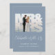 Chic dusty blue elopement und private Hochzeitsankündigung und die Einladung nach der Hochzeitsfeier mit Ihrem Foto ist in einem "Mr. & Mrs." Rahmen, "Celebrate With Uns" in einem modernen weißen Drehbuch und Ihren Namen, Hochzeitstag und Ort in schlichter weißer Typografie. Auf der Rückseite personalisieren Sie Ihre Hochzeitsankündigung oder Eröffnungsverkündung und Empfang-Einladung, und fügen Sie Ihre verheirateten Namen in ein signaturähnliches weiße Skript hinzu.