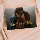 Save the Date eine Karte mit Wirblem Text, auf der auf dem Foto "rett unser Datum" in Gold steht.