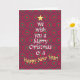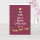 Eine schicke Weihnachtskarte mit "Wir wünschen Ihnen ein frohes Weihnachtsfest" in kühlem, weißem Schriftzeichen in Form eines Weihnachtsbaumes, auf einem farbenfrohen Hintergrund von Baubeln in Rot und Grün. Ein gelber Stern und "ein glückliches neues Jahr", in gelber Schrift, ergänzen dieses textbasierte, digitale Design von Judy Adamson.