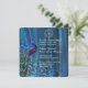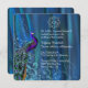 Eleganter, dunkeltürkisblauer Satin mit quadratischer Hochzeitseinladung, mit hübscher Grafik eines hellblauen blühend und einem farbenfrohen Pfau. Ein silberner Ton Ganesha schmückt die obere rechte Seite über dem benutzerdefinierten Textbereich. Matching-Produkte verfügbar.