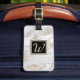 Der schicke Gepäckanhänger getan in einem Gold, weiß und im Grau marmorte Muster. Die Front des Umbaus hat einen Textbereich des Goldgrauen und schwarzen Quadrats, mit einem Singlebuchstabemonogramm. Die Rückseite des Umbaus hat kundenspezifischen Text. Personifizieren Sie das ein Buchstabemonogramm und -text, auf der Front und der Rückseite des Umbaus, zum Anzug Ihr Bedarf.
