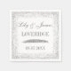 Personalisierte, schicke und gläserne Hochzeitsserviette mit elegantem grauem Text, einem silbernen Glitzer mit Konfetti-Rahmen und weißem Hintergrund. Sie können diese Serviette ganz einfach mit Ihren Namen, Ihrem Nachnamen und Ihrem Hochzeitstermin personalisieren. Sie können sogar die Textfarbe und den Stil des Schriftartes mit der Option Anpassen ändern! Ideal für eine Winterhochzeit!