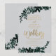 Chic gold Typografie Floral graue Hochzeitseinladung mit handgemalten grünen Aquarellblättern. Der graue Hintergrund ist vollständig anpassbar