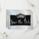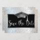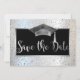 Eleganter silberner Glitzer Graduierte Kappe und Konfetti auf schwarzem Hintergrund.