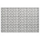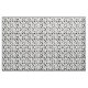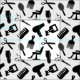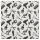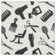 Gewebe mit einem Schwarzweiss-Muster der Silhouetten des unterschiedlichen Friseurs bearbeitet, wie Scheren, Kämme, Haartrockner, etc.