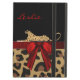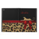 Stilvolle iPad Air-Hülle, mit eingebautem Ständer und Grafiken eines gepunkteten braunen und schwarz gefärbten Jaguar-Pelzmusters, unten, mit einem soliden schwarzen auf der Oberseite, des Gehäuses. Die Grafik eines rot-satinierten Bandes verläuft in der Mitte und hat einen hübschen roten Bogen, rechts. Die Grafik einer wilden gepunkteten großen Katze scheint über das Band zu liegen. Personalisieren Sie den roten Text. Dies ist eine hervorragende Geschenkidee.