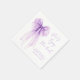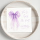 Elegante Servietten für Ihren Junggesellinnen-Abschied mit einer Wasserfarbe-Darstellung einer lila Kokettier-Schleife, "sie bindet den Knoten" in einer chic lila Kalligrafie-Schriftart und dem Namen der Braut und dem Datum des Abschieds in einfacher lila Schrift.