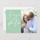 Dieses weiche Pfefferminzgrün Foto Save the Date Postkarteninklusiv bietet eine schicke, weiße Typografie für eine Zeremonie im Freien im Frühling. Einfach und elegant, einfach auf ruhigen, pastellgrünen Postkarten für einen Gartenplatz.