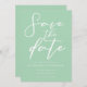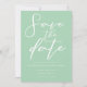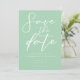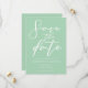 Diese weiche, grüne Save the Date-Karte zeichnet sich durch eine schicke, weiße Typografie für eine Zeremonie im Freien des Frühlings aus. Einfache und elegante Schrift auf einem ruhigen, massiven pastellgrünen laden zu einem Gartenlokal ein.