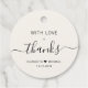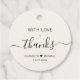 Chic helle Creme Gastgeschenk Hochzeit Tags mit "Mit Liebe + Dank" in schlichter moderner Typografie und ein elegantes Drehbuch mit Swashes, Ihre Namen durch ein Herz verbunden und Ihr Hochzeitstag.