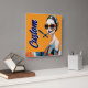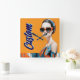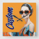 Individuell gestaltbares Design einer Frau mit kühnen Sonnenbrillen und geometrisch-gemusterter Einrichtung in auffallenden Orange- und Blautönen. Ein modernes, raffiniertes Design, das sich perfekt für Modeliebhaber eignet.