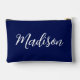 A chic personalized navy blue monogram cosmetic bag or pencil pouch for a girl who loves simple, handwritten gifts. Beautiful white cursive script spelling out your name in elegant script.