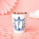 Diese chic pagoda Monogramm Becher sind perfekt für Unterhaltung und machen ein ausgezeichnetes Geschenk für die Gastgeberin. Die Pagode und das Monogramm sind in Marineblau auf Weiß.