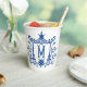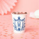 Diese chic pagoda Monogramm Becher sind perfekt für Unterhaltung und machen ein ausgezeichnetes Geschenk für die Gastgeberin. Die Pagode und das Monogramm sind in Marineblau auf Weiß.