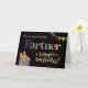Eine helle und farbenfrohe Geburtstagskarte für einen Partner, mit Birthday Cake Candles, Bunting and Stars und dem Wort "Partner" in gemusterter Schrift, in Goldeffekt (nicht in metallischer Tinte) und Happy Birthday, auch in Goldeffekt, auf schwarzem Hintergrund. Ein digitales Design von Judy Adamson.