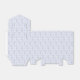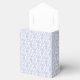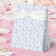Eine schicke Zelt-Gefallen-Box mit einem Muster von hellen blauen Periwinkle-Blume-Konturen, in einer Diamantform auf einem weißen Hintergrund. Als Teil der Posh und Painterly 'Periwinkle Patch' Kollektion kann dieses Muster leicht an jede Gefälligkeitsbox angepasst werden.