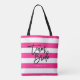 All-Over-Print-Tasche mit den Worten "Team Bride" in schwarzem Trendskript vor einem Hintergrund aus rosa und weißen Streifen. Ideal für Hochzeiten von Brautmädchen, Trauzeugin und Blume. Weitere passende Elemente finden Sie hier https://www.zazzle.com/collections/119250194970828530?rf=238364477188679314 Personalisieren Sie sie durch Ersetzen des Platzhaltertextes. Für weitere Optionen, wie zum Beispiel den Schriftart zu ändern und seine Größe, Farbe oder den Abstand zwischen den Buchstaben, klicken Sie auf die Schaltfläche "Anpassen". *Bitte beachten Sie, dass das Zazzle-Wasserzeichen, das in der Zoomvorschau angezeigt wird, nicht auf dem gedruckten Endprodukt angezeigt wird. © Rosewood and Citrus