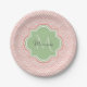 Chic hellrosa Deko gewölbte Skallop-Musterpapiere Teller mit einem weichen grünen Quatrefolien-Abzeichen können Sie personalisieren, indem Sie einfach Ihre eigenen Monogramm und Namen hinzufügen. Dies ist Teil der blühenden Dahlia Scallops Nile Green Monogram Spring Collection.