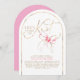 This She’s Tying the Knot bridal shower invitation blends timeless romance with a playful, modern spirit. Flowing gold calligraphy sweeps across a crisp white background, instantly setting a joyful and celebratory tone. A hand-painted pink watercolor bow adds a charming finishing touch—like the ribbon on a thoughtfully wrapped gift—soft, unexpected, and undeniably chic. The graceful arch shape brings a sculptural quality to the design, creating a fresh silhouette that feels both modern and meaningful.