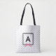 Chic monogramm Tote-Tasche mit einem schwarzen Rand Quadrat mit einem rosa Band gegen ein Schwarz-Weiß Polka Punkt Muster. Personalisieren Sie es, indem Sie den Platzhalter-Text ersetzen. Für weitere Optionen, wie zum Beispiel den Schriftart und seine Größe ändern, klicken Sie auf die Schaltfläche "Anpassen". *Bitte beachten Sie, dass das Zazzle-Wasserzeichen, das in der Zoomvorschau angezeigt wird, NICHT auf dem gedruckten Endprodukt erscheint. © Rosewood and Citrus