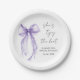 Chic bridal shower paper plates featuring an elegant purple coquette bow watercolor, "She's tying the knot" in a calligraphy script, and the bride's name and the shower date in simple modern lettering.