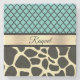 Ein elegantes Quatrefolienmuster in türkisfarbenem Hintergrund, ein goldenes Band für die Personalisierung und darunter ein stilvolles Giraffenprint für tierische exotische Villen.