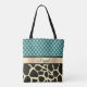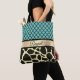 Ein elegantes Quatrefolienmuster in türkisfarbenem Hintergrund, ein goldenes Band für die Personalisierung und darunter ein stilvolles Giraffenprint für tierische exotische Villen.