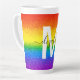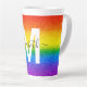 Genießen Sie Ihren morgendlichen Kaffee in stilvollem Ambiente mit diesem Glitzer und der verglasten Latte Tasse. Das schicke, mit Regenbogen gestreifte Design umfasst Rot-, Orange-, Gelb-, Grün-, Blau- und lila Imitat-Glitzer mit einem Monogramm, das zunächst in Weiß und Name in modernem Schwarz-Script für Sie personalisiert. Zeige deinen Stolz!