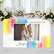 Schönes Regenbogen-Hochzeitsfest-Banner mit hübschen, künstlerischen Malstrichen voller heller Farbe. Diese farbenfrohe Dekoration ist ideal für ein künstlerisches Paar oder einen schwulen und lesbischen Empfang. Die fröhliche Aquarellfarbe zeigt Ihr Foto in der Verlobung unter Ihrer Begrüßungsbotschaft.