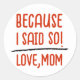 Dieser lebendige Aufkleber rühmt sich einer humorvollen, aber überzeugenden Botschaft der geliebten Mutter: "Weil ich so gesagt habe!" Die markante rote Typografie vor weißem Hintergrund strahlt sowohl mütterlichen Power als auch Zuneigung aus. Mit einem minimalistischen kreideartigen Design bietet es eine personalisierte Touch mit anpassbaren Text- und Signaturoptionen. Ideal für Mütter und Großmütter, die einen herzlichen Ausdruck von Liebe und Autorität suchen.
