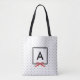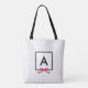 Chic monogramm Tote-Tasche mit einem schwarzen Rand Quadrat mit einem roten Band gegen ein Schwarz-Weiß Polka Dot Muster. Gut wie Geschenke für Familie und Freunde oder für sich selbst. Personalisieren Sie es, indem Sie den Platzhalter-Text ersetzen. Für weitere Optionen, wie zum Beispiel den Schriftart und seine Größe ändern, klicken Sie auf die Schaltfläche "Anpassen". *Bitte beachten Sie, dass das Zazzle-Wasserzeichen, das in der Zoomvorschau angezeigt wird, NICHT auf dem gedruckten Endprodukt erscheint. © Rosewood and Citrus