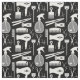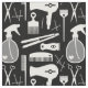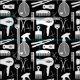 Haarstylistische Stoffe in einem schicken Retro-Design mit Haarsalonwerkzeug in Weiß mit niedlichen kleinen Herzen auf schwarzem Hintergrund.