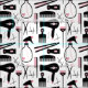 Haarstylistische Stoffe in einem schicken Retro-Design mit Haarsalonwerkzeugen in Schwarz, Rosa und Weiß mit niedlichen kleinen Herzen.