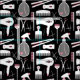 Haarstylistische Stoffe in einem schicken Retro-Design mit Haarsalonwerkzeugen in weiß und rosa mit niedlichen kleinen Herzen auf schwarzem Hintergrund.