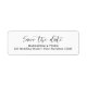 Chic Save the Date Rücksendeaufkleber für Hochzeiten mit einfacher und schwarzer Schrift-Kalligrafie, vor weißem Hintergrund. Diese eleganten Rücksendeadressen-Aufkleber können Sie ganz einfach mit Ihrem eigenen Text personalisieren.