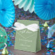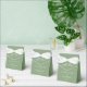 Diese schlichte, solide und solide Gastgeschenk Hochzeit bietet elegante, weiße Schrift für eine Feier im Freien in einer Naturlandschaft. Minimalistische Typografie auf friedlichen hellgrünen Boxen für einen rustikalen Ort außerhalb eines Waldes von Bäumen.