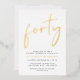 Erleben Sie Ihr 40. Geburtstagsgeschenk mit dieser schicken Einladung, die "vierzig" in einem stilvollen Drehbuch und Ihren Namen in eleganter Serifentypografie, in Ihrer Wahl von Original-Gold, Silberfolie oder Rose-Goldfolie, und die Party-Details in einfachen, modernen Schriften.