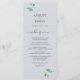 Elegantes, einfaches Hochzeitsmenü mit dunkelblauer Schriftzeichen und einer stylischen Touch grüner Eukalyptus-Blätter auf pastellblauem Hintergrund. Fügen Sie einfach Ihre Hochzeitsdetails hinzu. Exklusiv für Sie entworfen von Happy Dolphin Studio. Wenn Sie Fragen oder Wünsche haben, kontaktieren Sie uns bitte unter happydolphinstudio@outlook.com. Wir helfen Ihnen gerne, Ihre Hochzeit zum schönsten Tag zu machen!