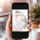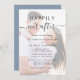 Moderne dustige blaue Hochzeitseinladung mit Ihrem Foto überlagert mit Ihrer individuellen Einladung "Happily Ever After" in einer Mischung aus einfacher Typografie und einem schicken Drehbuch mit Swashes und Ihren Einladungsdetails in eleganter Typografie. Auf der Rückseite sind Ihre Namen und das Hochzeitstag mit einem Herz verbunden.