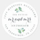 Chic, modern und einfach Hochzeitskalligraphie klassischer Rundaufkleber mit dem Text der Zukunft Mr. und Mrs. in cremefarbener, eleganter Schriftzeichen auf weißem Hintergrund mit einer stilvollen Touch von grünem Eukalyptus-Blattwerk. Fügen Sie einfach Ihren Namen und Ihre Adresse hinzu. Exklusiv für Sie entworfen von Happy Dolphin Studio. Wenn Sie Hilfe oder passende Produkte benötigen, kontaktieren Sie uns bitte unter happydolphinstudio@outlook.com. Wir helfen Ihnen gerne, Ihre Hochzeit zum schönsten Tag zu machen!