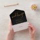 Ein stilvolles Ambiente in einer Hochzeitseinladung mit eleganter moderner Typografie und einem schicken goldenen Herz und Monogramm-Initialen auf schwarzem Hintergrund. Die Einladung enthält eine perforierte RSVP-Karte, die für Sie individuell adressiert oder links als leere Adresse für die Handschrift der Adressdaten Ihres Gastes verwendet werden kann. Entwickelt von Thisisnotme©