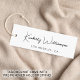 Elegante und schicke Kleidung, Accessoires, Schmuck, Boutique, usw., weiße Etiketten hängen Anhänger mit minimalistischem Flair, der Ihren Namen oder Ihre Marke in einem stilvollen Signaturskript zeigt. Fügen Sie unten und auf der Rückseite einen zusätzlichen Text in einfacher moderner Typografie hinzu.