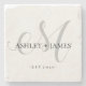 Chic, moderner silberner mit Monogramm Stein-Untersetzer mit Ihren Namen und Jahr etabliert in schwarz elegante handgeschriebene Skriptkalligraphie und klassische Typografie mit einem silbernen M Monogramm auf weißem Hintergrund. Fügen Sie einfach Ihre Namen, Monogramm und Jahr unten festgelegt hinzu. Stilvolles Design und perfektes Luxusgeschenk für das frisch vermählte Paar. Kontaktieren Sie mich für andere Monogramme durch den Chat des Stores! Wir helfen Ihnen gerne, Ihre Hochzeit zum schönsten Tag zu machen! Exklusiv für Sie entworfen von Happy Dolphin Studio.