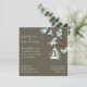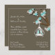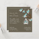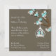 Stylische, maßgeschneiderte Hochzeitseinladung in taupe, mit weißem Text bereit, um für Ihren Hochzeitstag personalisieren. Elegante grafische Kunstwerke eines blühenden Baumzweiges mit einem Paar Aquamarin-farbener Liebesvögel, die in einem weißen Käfig hängen.