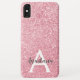Chic und Glam blush rosa Rosa Gold Glitzer Glitzern metallische iPhone Gehäuse, mit einem großen, weißen Monogramm Initial und Ihrem individuelle Name in einem eleganten grauen Drehbuch-Schriftart. Personalisieren Sie diesen trendy Fall mit Ihrem Namen oder Monogramm Initial. Sie können die Textfarbe, den Schriftart und die Schriftgröße mit der Option Anpassen ändern.