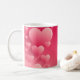Eine wunderschöne Valentinstag Geschenkidee Tasse, mit der Sie das ganze Jahr über zufrieden sein werden. Das Design zeichnet sich durch rosafarbene Herzen verschiedener Größen vor einem rosa bis roten Hintergrund aus, der die Tasse umkreist und Platz für einen langen Namen hat, in einem mittelrosa Skript-Schriftart, vor einem größeren, leichteren offenen Schriftart Single Anfangs- oder Monogramm.